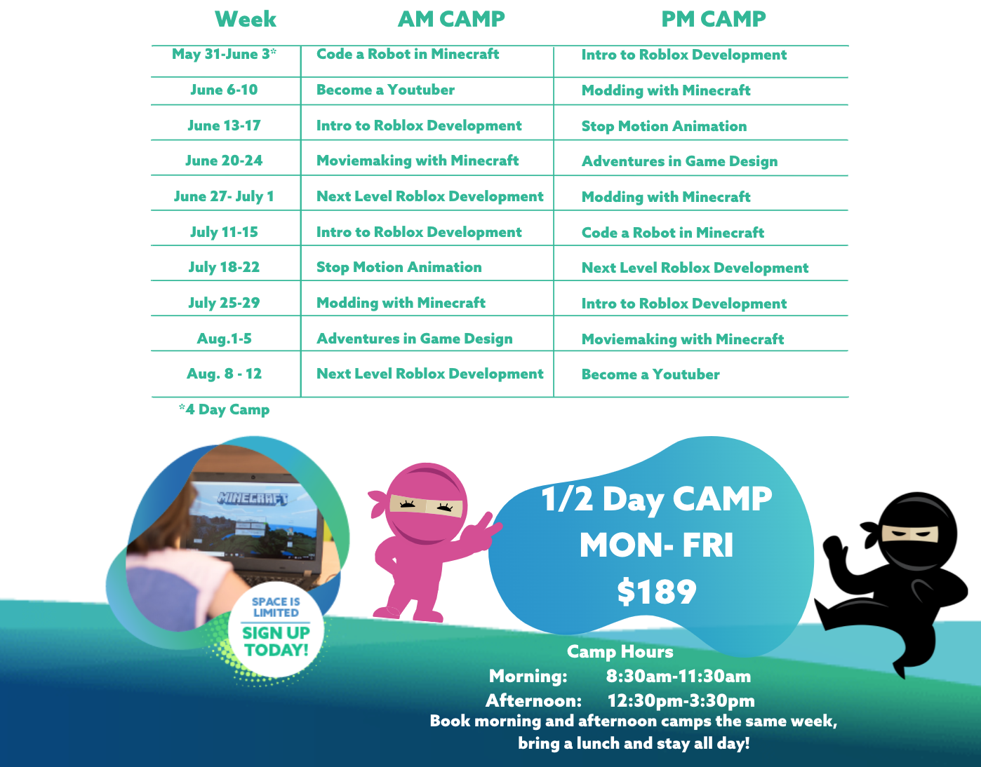 Unlock Your Potential! Have a hands-on, fully guided experience and learn the basics of game building in Roblox! Throughout the week we will teach you how to plan, design, and build your very own 3D world and so much more.